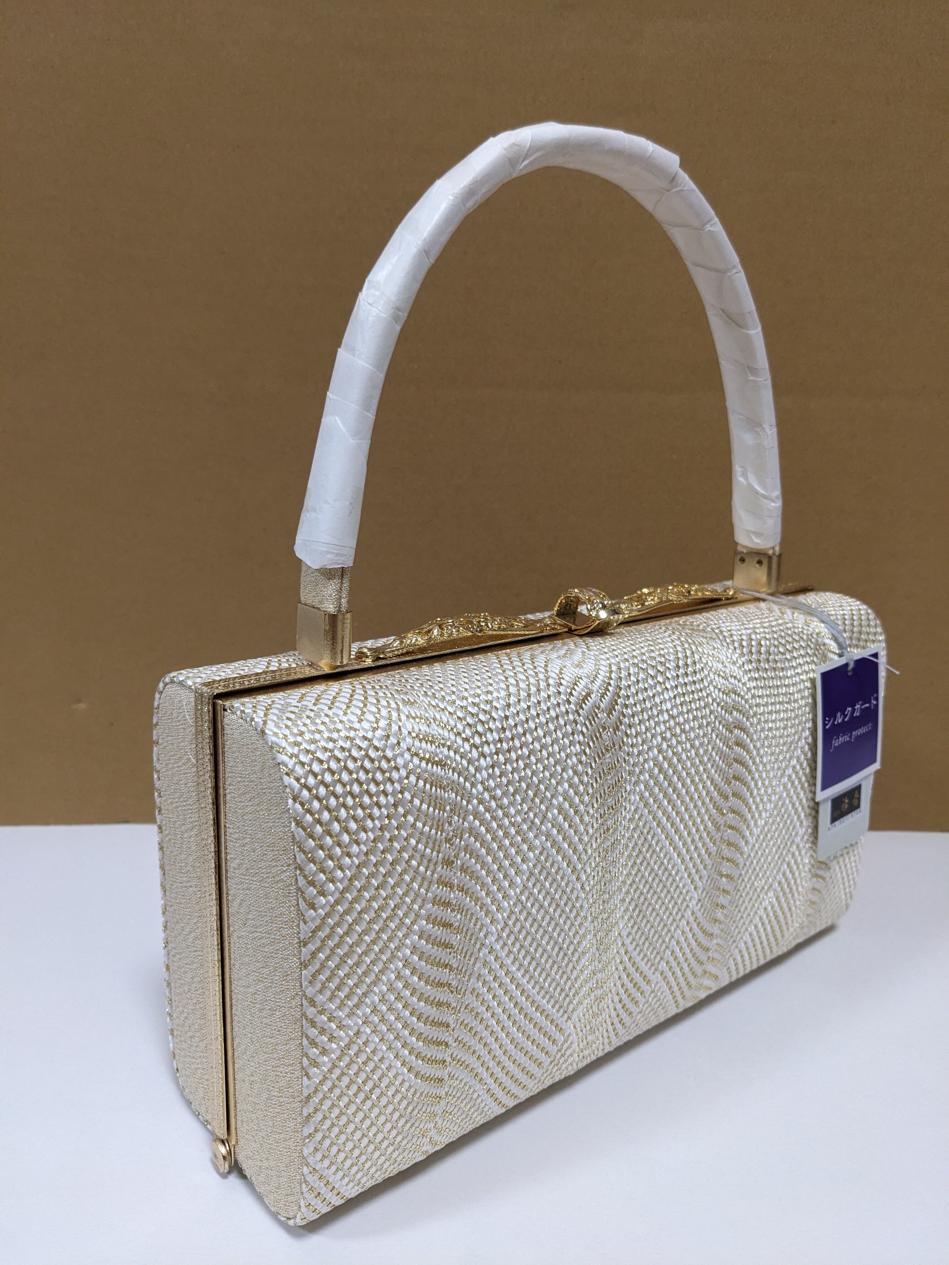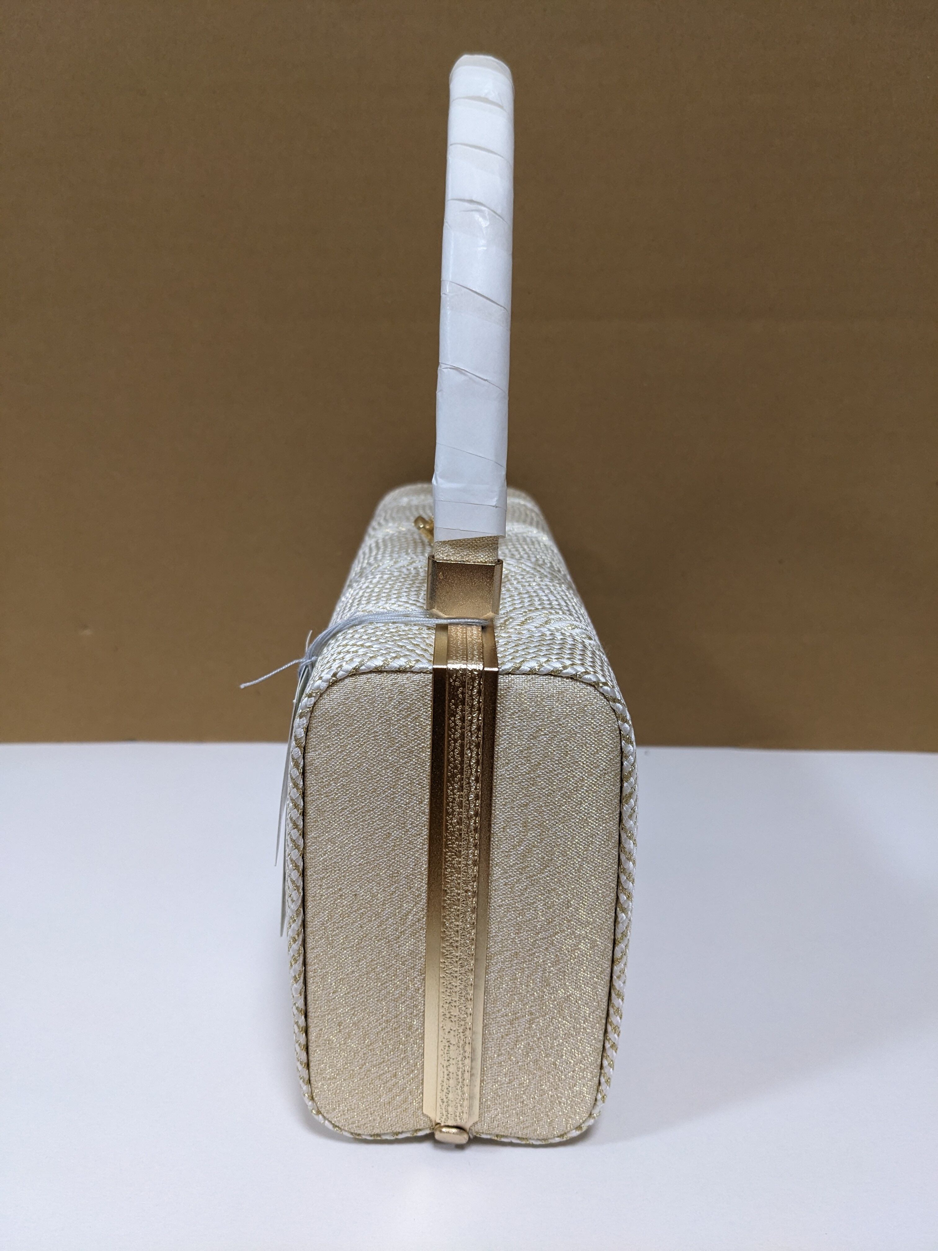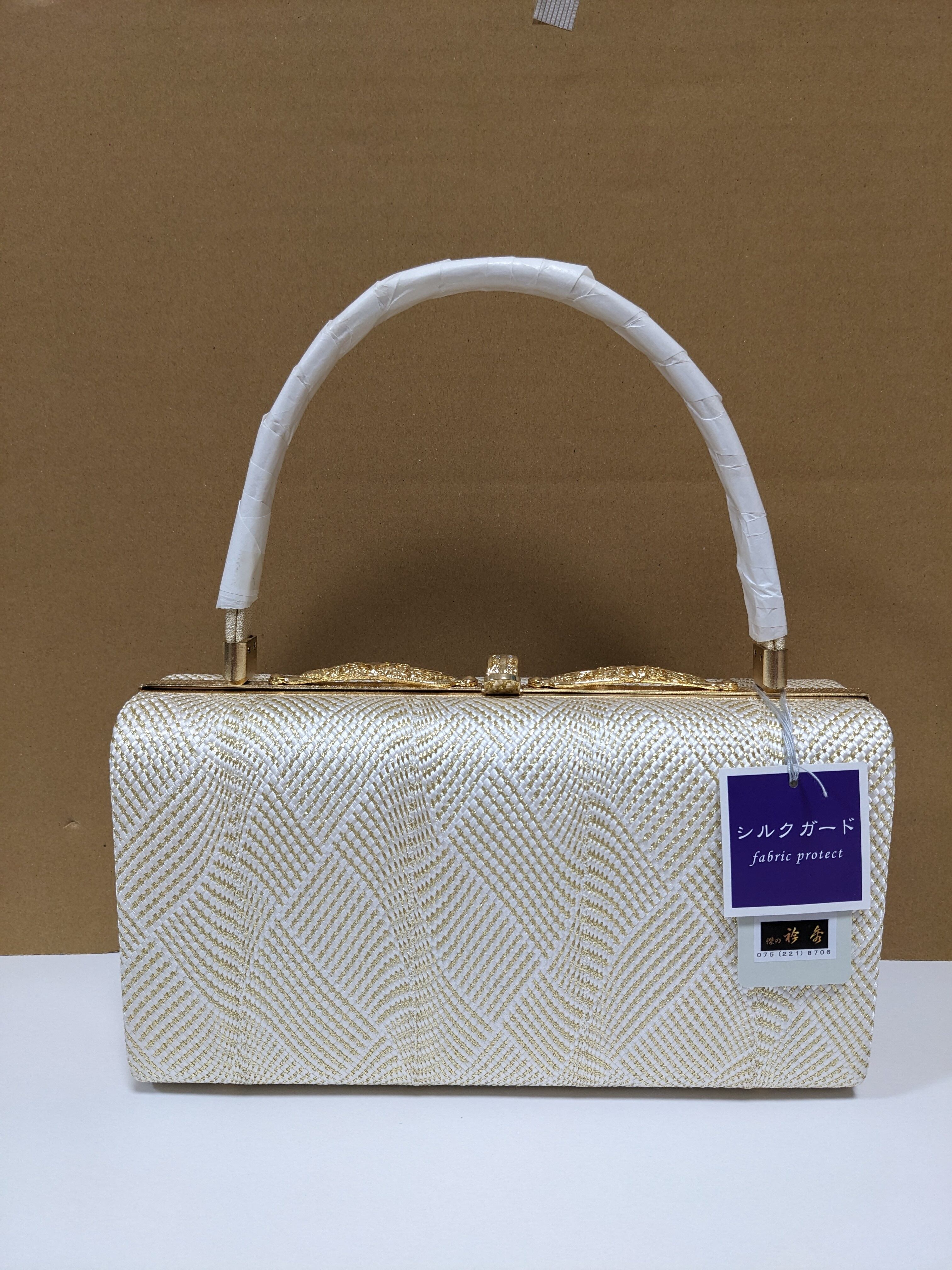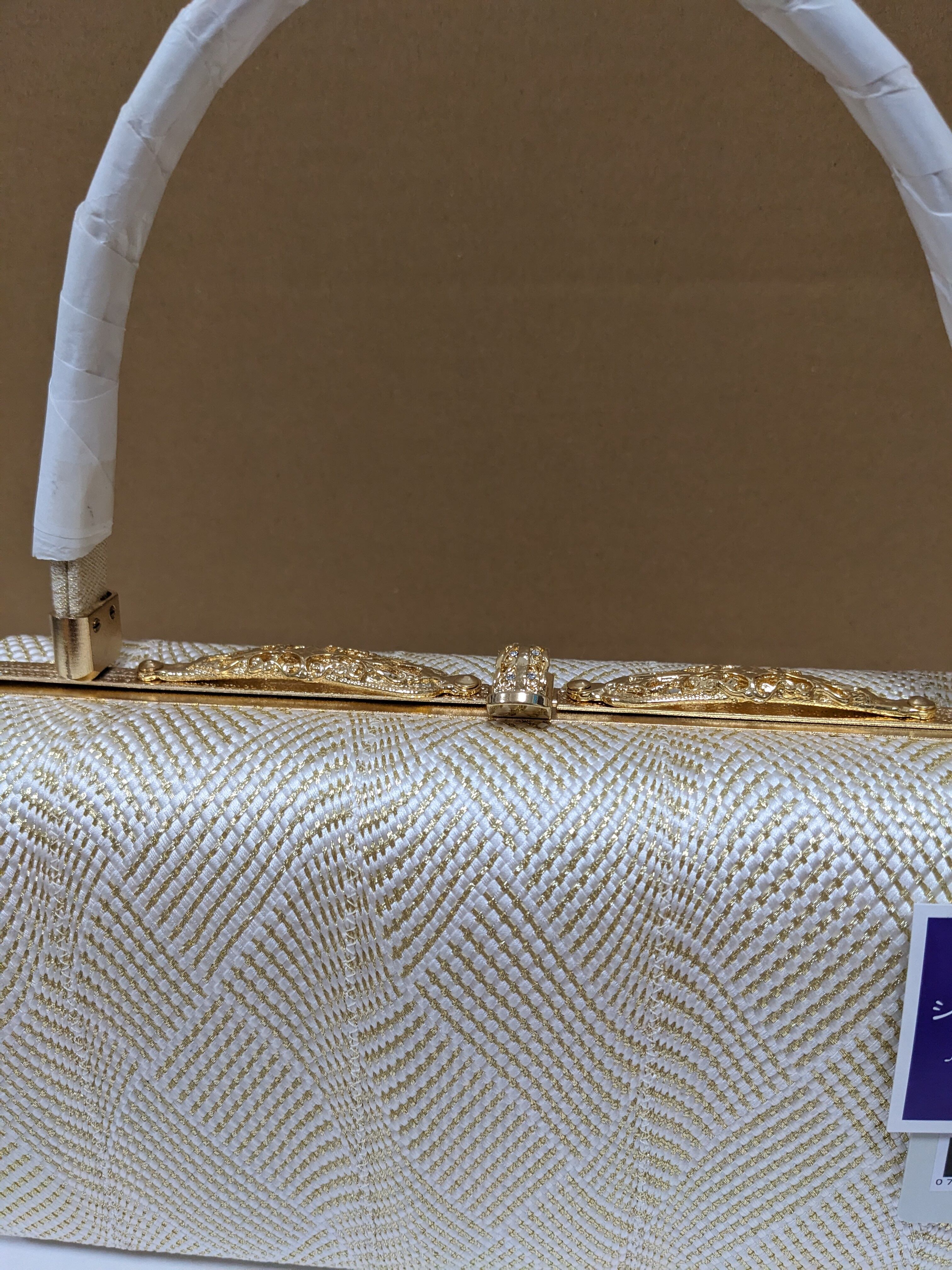 白とゴールドの組織の生地のバックとなります。