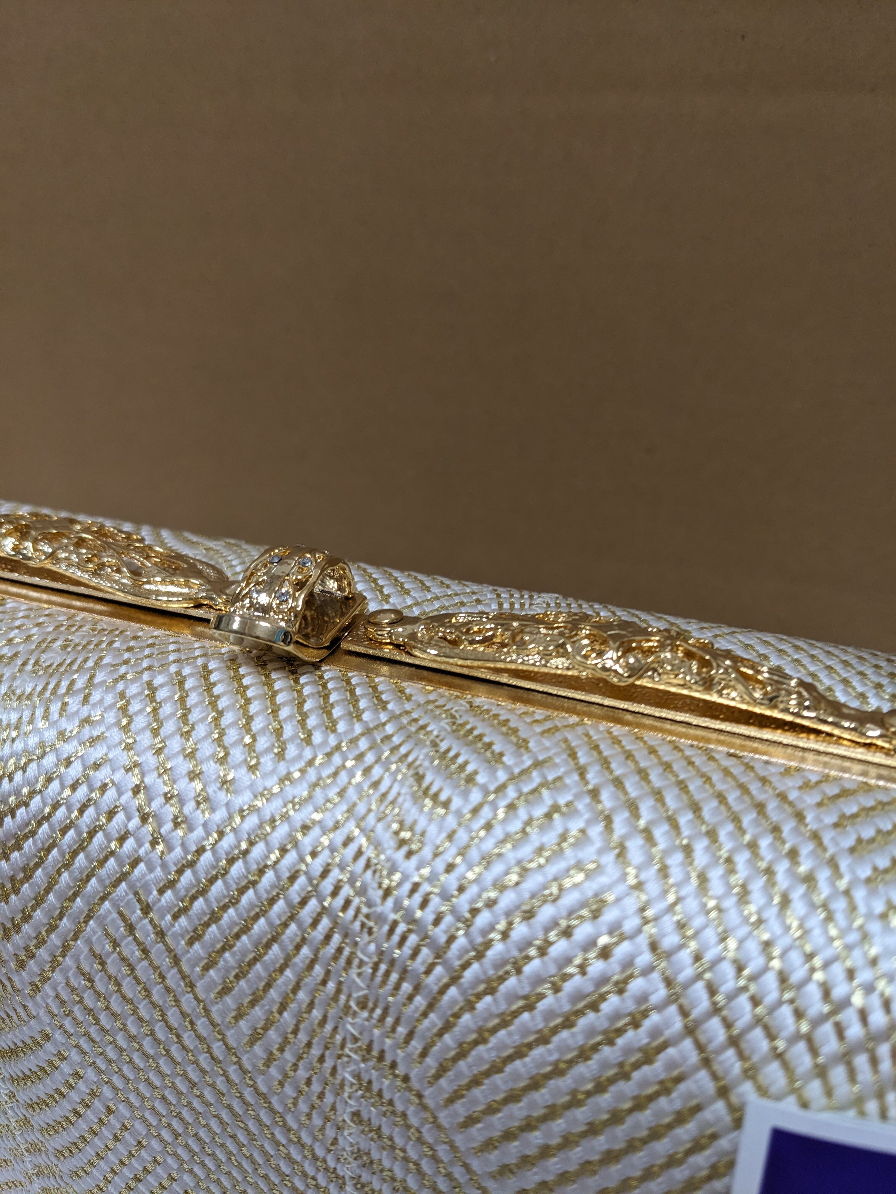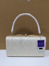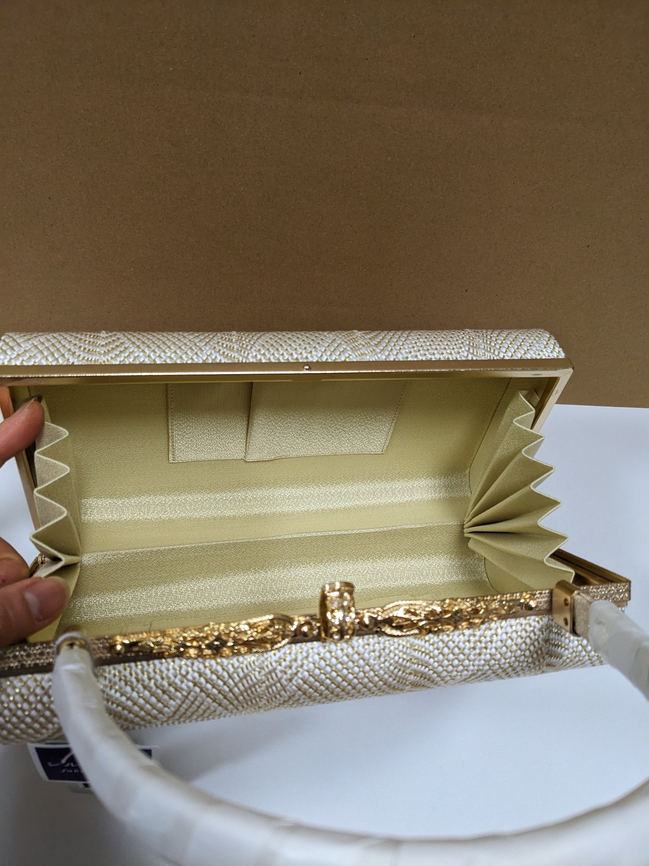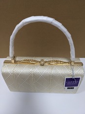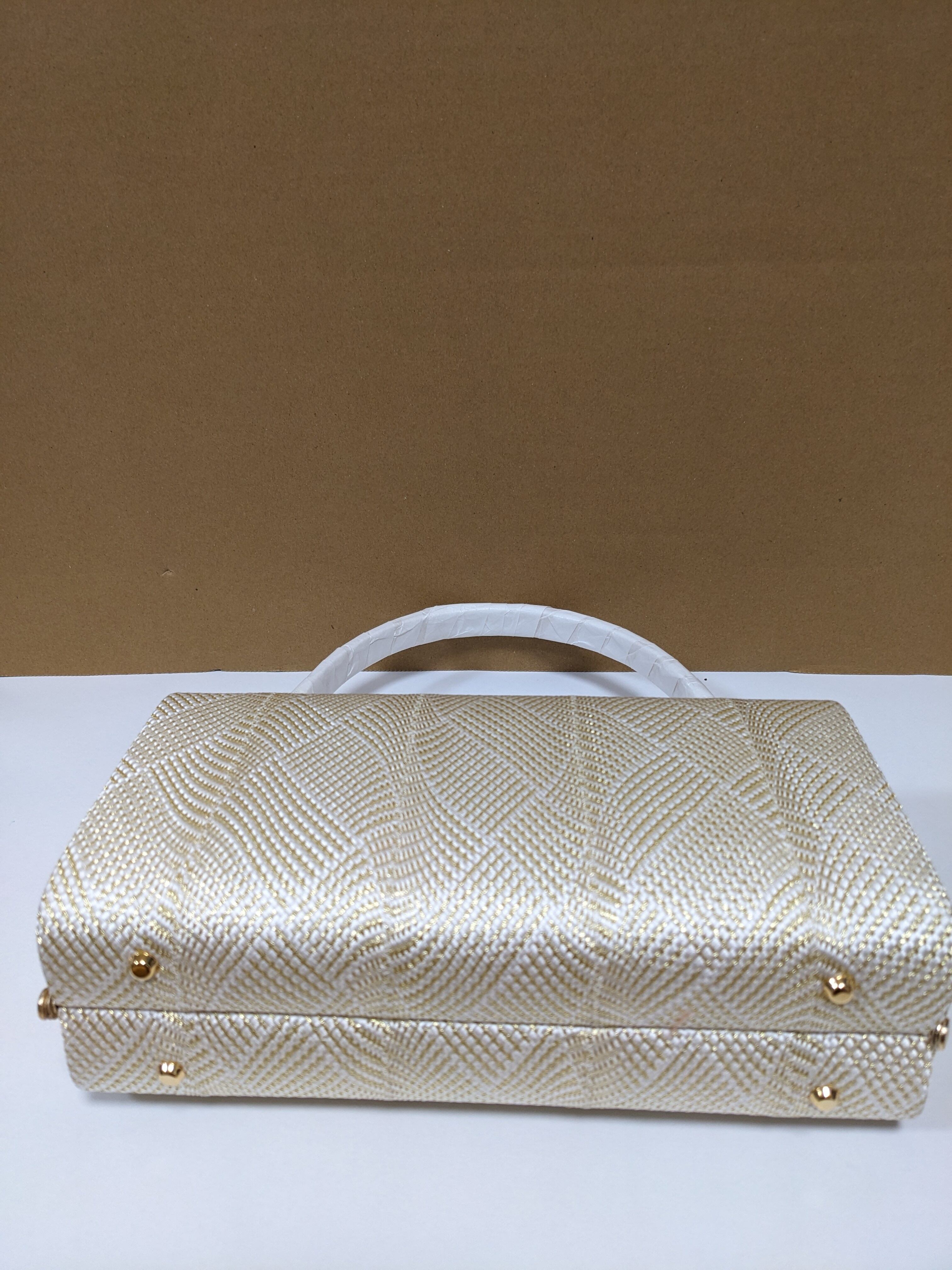 白とゴールドの組織の生地のバックとなります。