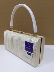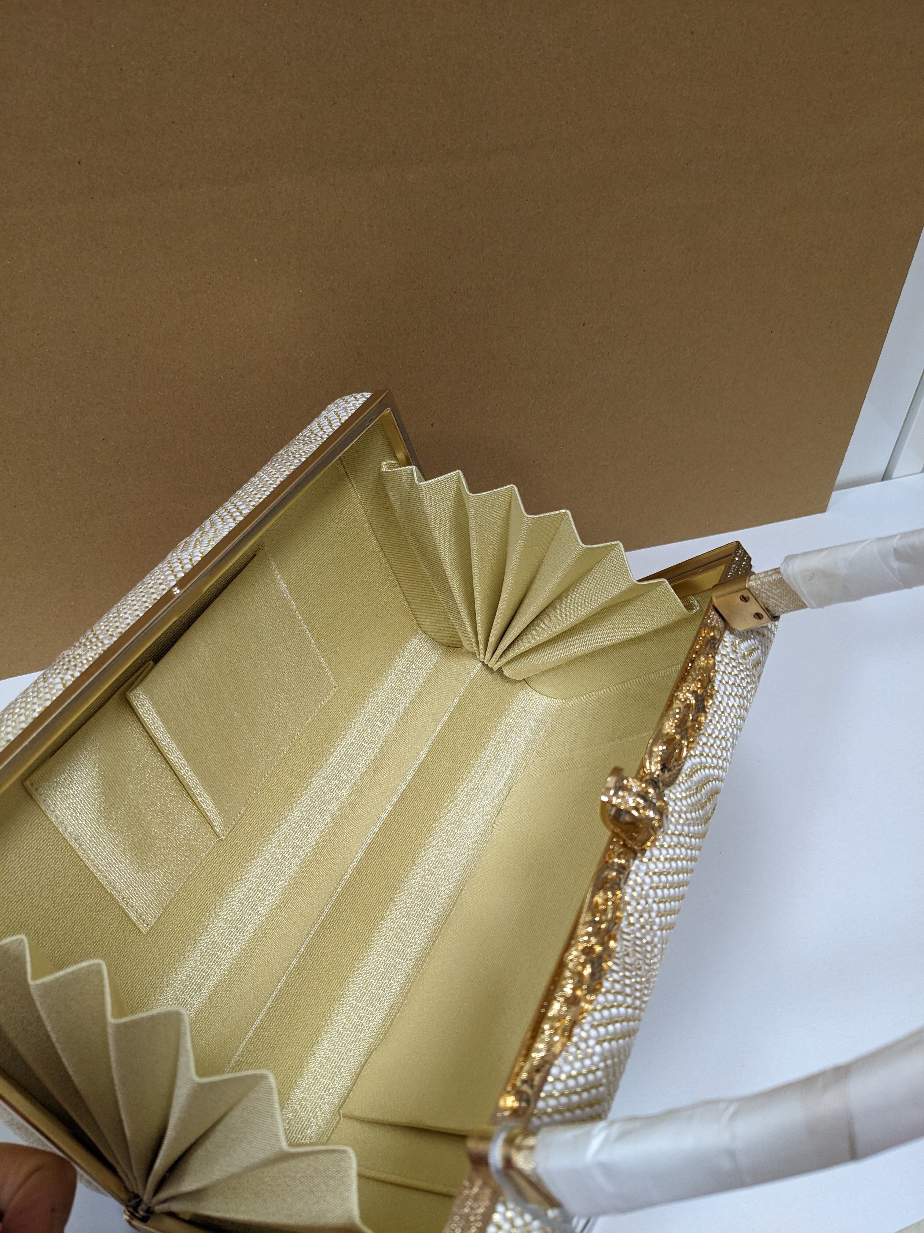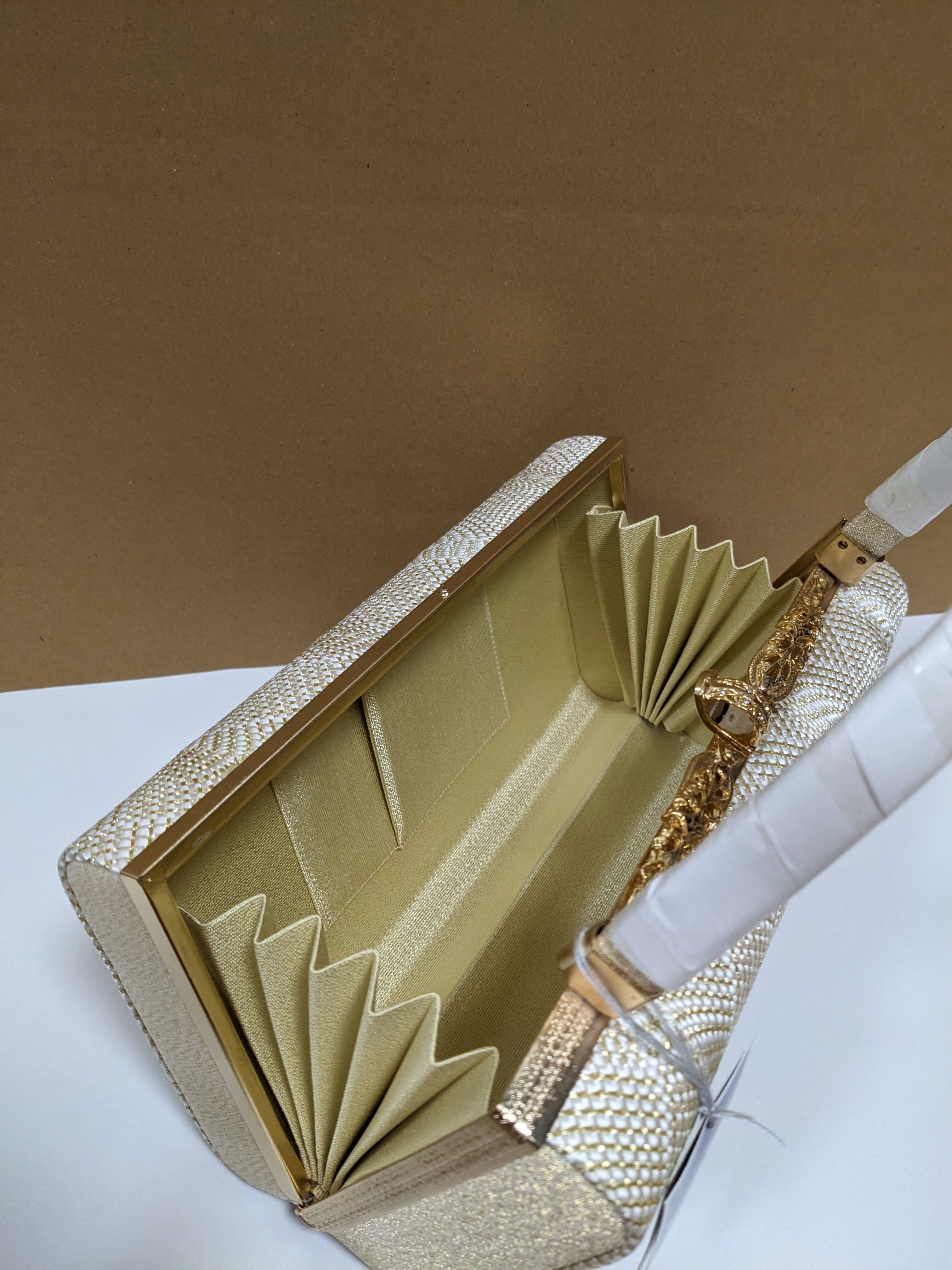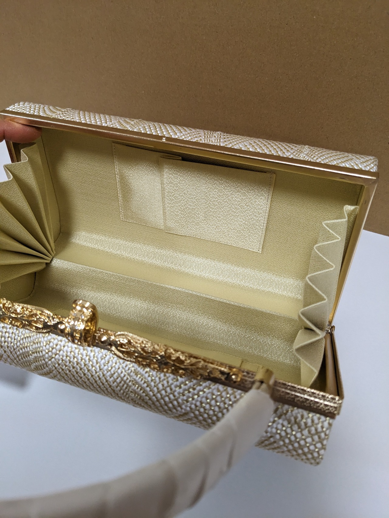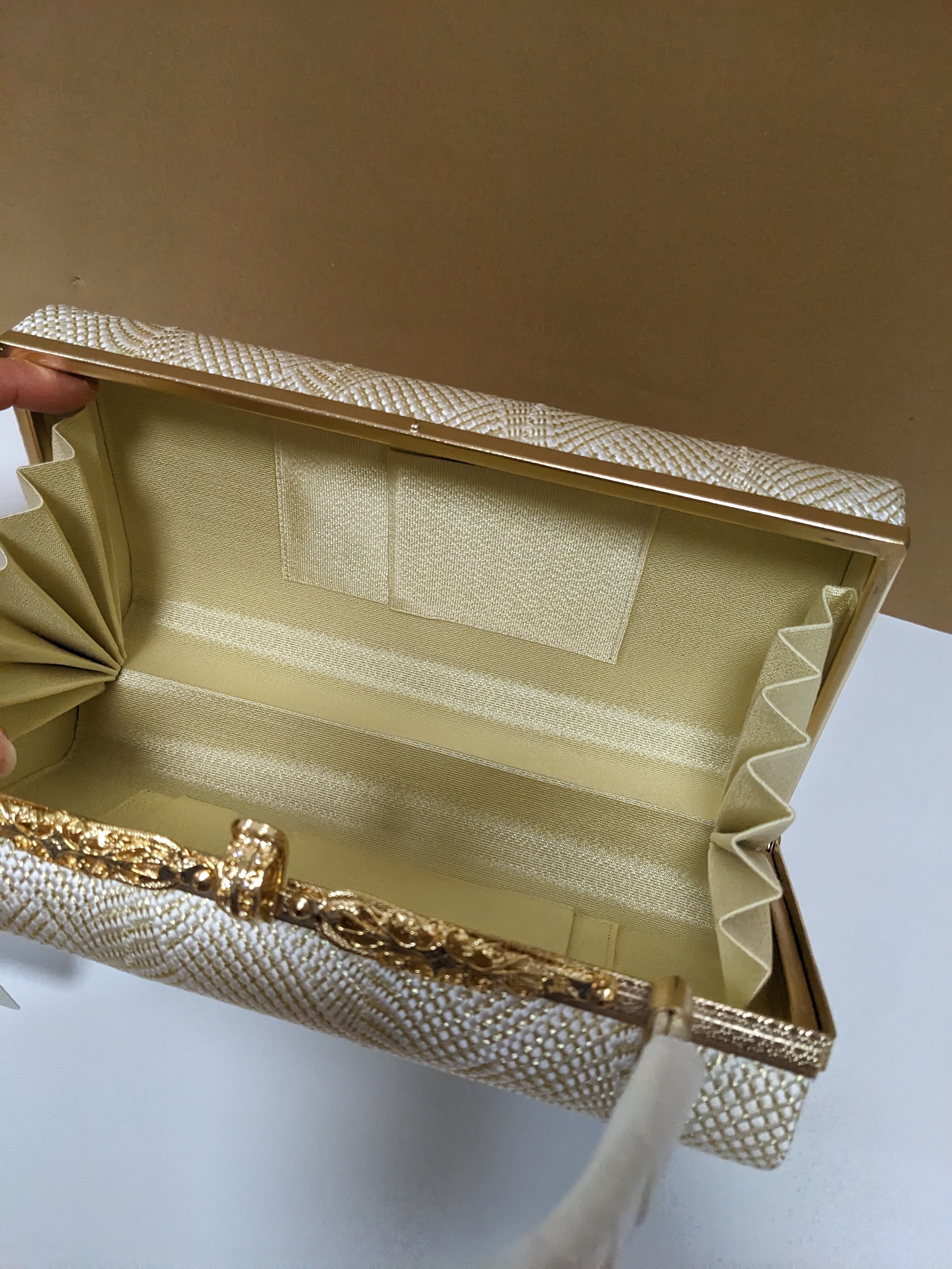 白とゴールドの組織の生地のバックとなります。