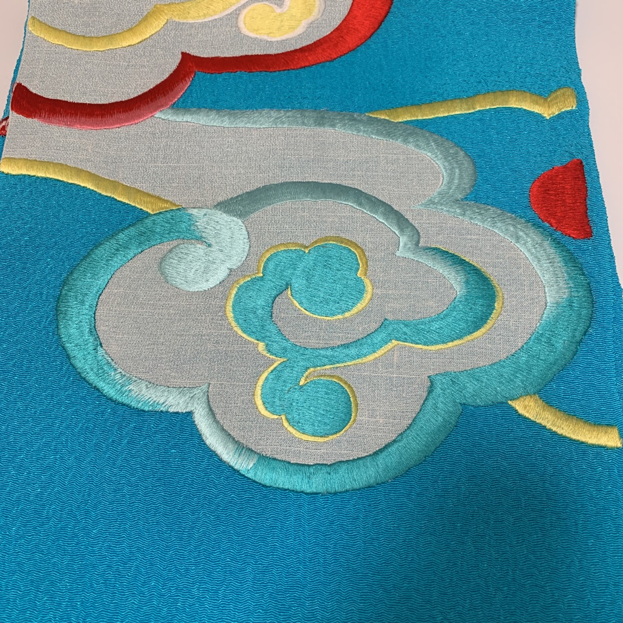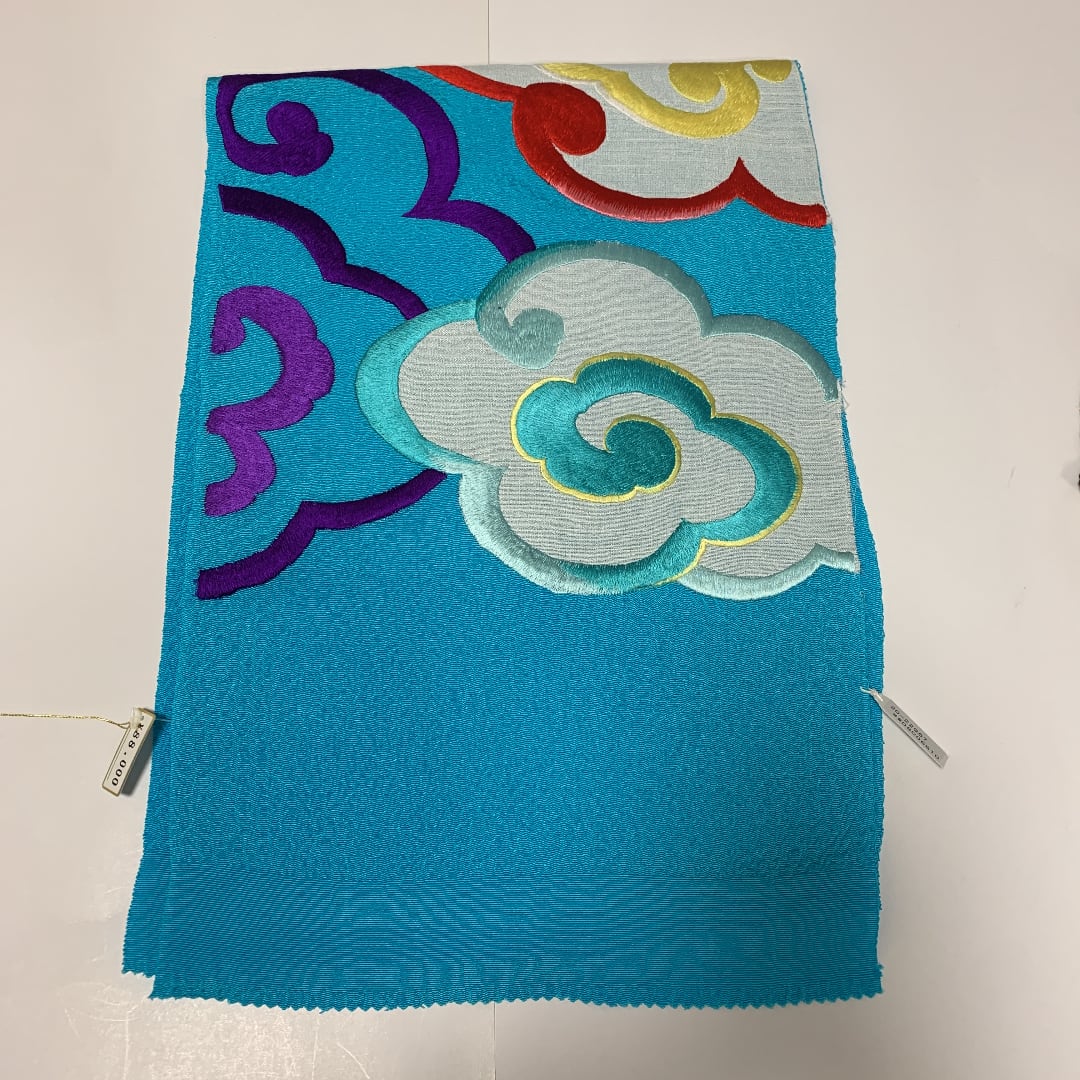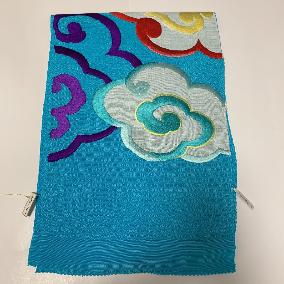 こちらはブルー地のおにしぼ縮緬に瑞雲の柄の刺繍がしてある帯揚げです。生地もしぼの大きい縮緬ですし、刺繍にはボリューム感がありますので、大変豪華です。お着物姿もステキになるかと思います。